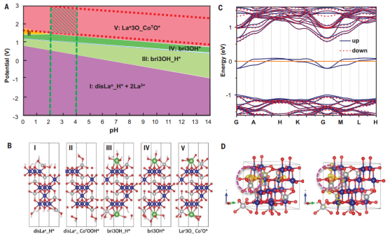 要点: 1.对于可用于PEMWE的钴尖晶石基OER催化剂,最大的挑战是在酸性介质中的稳定性。为了更好地理解LMCF在电解条件下增强的耐酸性,本研究计算了La修饰的Co3O4 (111)面的表面Pourbaix图(图4A),因为它代表STEM观察到的LMCF中的主要面(图1F、G和I)。Pourbaix图由五个区域组成,它们的中间状态配置如图4B所示。 2.电催化中的另一个关键问题是氧化物本身固有的电子传导性。本研究对LMCF的计算表明,用Co3O4晶格中均匀分布的Mn3+离子替代低浓度的Co3+离子会在中间带隙中诱发两个部分占据的缺陷态(图4C和D)。Mn诱导的电子波函数与邻近的Co离子明显重叠,导致明显的色散,因此具有良好的电子迁移率。这提供了基于块体的电子电导率的直接增强,其与纳米纤维氧化物网络的连接性相结合,为LMCF提供了高的电导率值。本研究通过四探针范德堡方法的实验进一步证实了电子电导率的提高。
