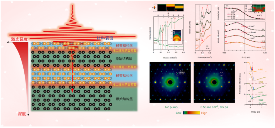 二维电子态中存在众多奇异的量子现象,如量子霍尔效应(1985年诺贝尔物理奖)、石墨烯中的狄拉克电子态(2010年诺贝尔物理奖)和超导增强等。这些二维电子态通常通过机械剥离、人工异质结、分子束外延生长等方法制造人工结构来实现;本研究提出并实现了在量子材料中利用超快激光调控产生二维电子态的新方法。该方法利用在特定激光强度下激发相干电子—声子相互作用所引起的材料晶格宏观周期性畸变,结合激光在材料中由于穿透深度引起的强度分布,从而导致这种晶格畸变在材料中分层出现并在晶格畸变层与原始层之间实现了一种长程有序的二维电子态。