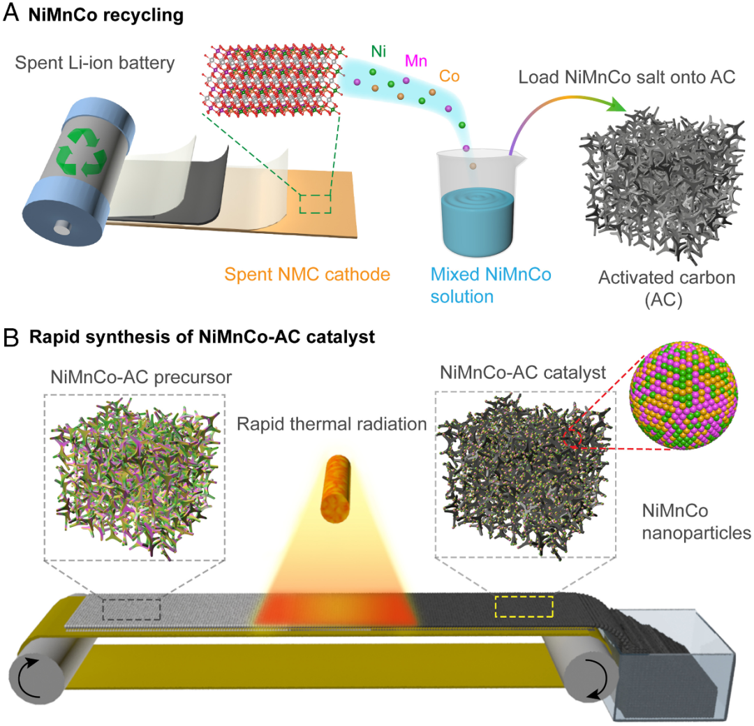 图3. 用废锂制备NiMnCo-AC催化剂的工艺示意图。(A)从耗尽的LIB中回收NiMnCo。将废NMC532阴极溶解在硝酸中,得到混合NiMnCo溶液。然后,将NiMnCo盐加载在AC上制备NiMnCo-AC前驱体。(B)快速热辐射法连续合成NiMnCo-AC催化剂的原理图。NiMnCo-AC前驱体由传送带驱动并通过辐射加热区移动。形成NiMnCo纳米颗粒,并均匀地分散在AC载体表面。