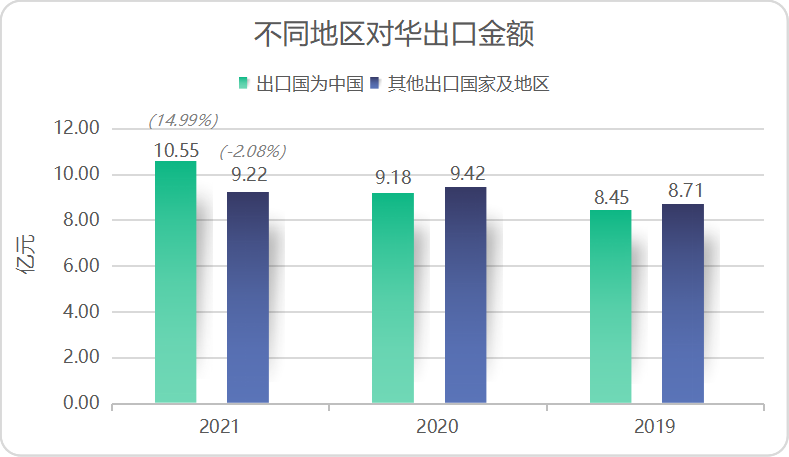 从不同地区对华出口数据看,2021年产自“中国”的进口气相色谱仪的数量较之上年同期更是取得超过30%的增长,金额上也有接近15%的增长。而反观“其他出口国家及地区”则呈现震荡趋势(如图三、四所示)。跨国品牌的“国产化”脚步正在提速。