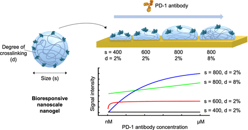 表面等离子体共振 (SPR) 现象已被广泛研究以检测生物分子,因为它们具有高灵敏度和确定生物分子与动力学信息的相互作用的能力。然而,在与目标生物分子相关的特定浓度范围内进行高选择性检测仍然是一项具有挑战性的任务。最近,我们开发了生物响应纳米级水凝胶,通过多价蛋白结合 (MPB) 事件与包括 IL-2 在内的目标生物分子选择性地增强 SPR 信号,我们能够展示对目标生物分子的卓越选择性,而对非特异性和单价结合事件的反应最小。在这项工作中,我们系统地探索了具有 MPB 能力的纳米级水凝胶的物理特性与其在程序性细胞死亡蛋白 1 抗体 (PD-1Ab) 作为模型靶生物分子存在下诱导的 SPR 反应之间的关系。首先,我们开发了一种合成方案,通过控制各种反应参数来构建具有不同尺寸(从 400 nm 到 1 μm)和交联度(从2 至 8%)。然后,通过将具有 MPB 能力的 PD-1 受体结合到 NH 表面以形成 PD-1 响应的纳米级水凝胶 (PNH),研究了其 SPR 响应的水凝胶尺寸和交联依赖性。我们的结果揭示了适当的水凝胶尺寸方案和交联度,用于在几 nM 和 1 μM 之间的特定浓度范围内有效检测 PD-1Ab。总体而言,我们的研究表明,通过调整纳米级水凝胶基质的物理特性,可以调节基于 MPB 的 SPR 传感器的灵敏度和检测范围,从而可能有利于临床应用,例如监测各种治疗性生物分子。