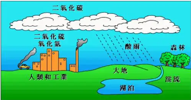 由于空气中的二氧化碳气体与水反应生成碳酸,碳酸显酸性,因此正常雨水略带酸性,其pH≈5.6,而随着经济的迅速发展,伴随着大气污染愈发严重,导致大气降水的pH小于5.6,原因离不开两大酸即硝酸和硫酸。大多数人认为酸雨即pH<5.6的雨水,其实不然,除了雨还有雪、霜、冰雹、露水、雾等大气降水只要其pH<5.6,都被称作酸雨,酸雨也可称作湿沉降[1]。那么酸雨是如何形成的呢?