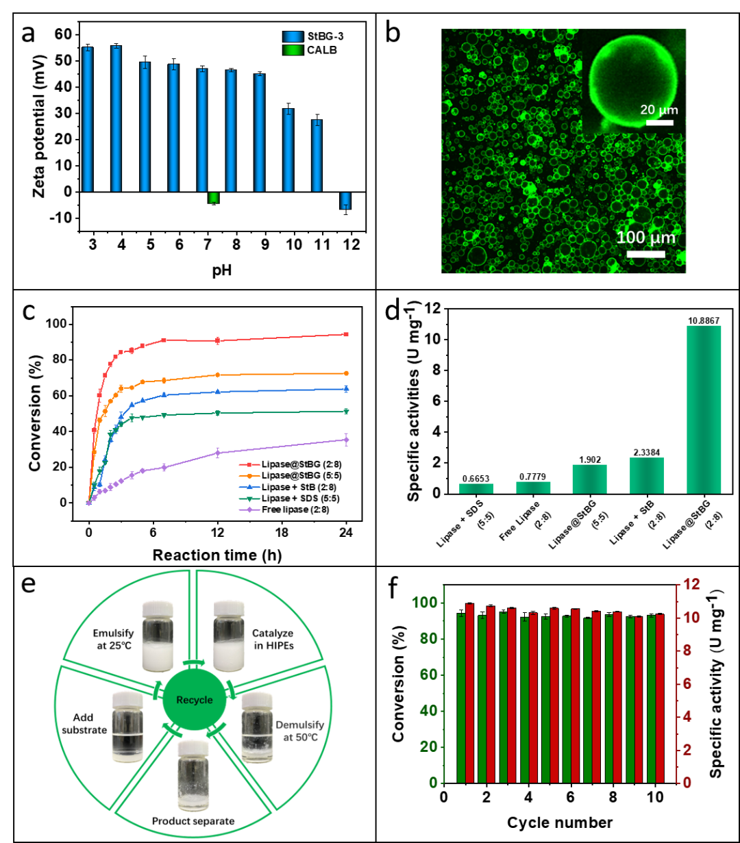 作者还证明了上述整个催化过程具有易分离性和可回复性。在固定化酶 Pickering 高内相乳液体系中反复进行了 10个循环的生物催化水解实验。在整个循环催化过程中,通过改变环境温度来实现脂肪酶固定化 StBG粒子的回收、产物的分离和乳液的回复,从而避免了使用传统的离心、过滤等耗时耗能的方法。在循环催化过程中己酸己酯的转化率均保持在 80%以上,且循环10次后脂肪酶的比活度还保持在 10.1022 U mg-1,说明固定在淀粉粒子上的脂肪酶在水解过程中几乎没有失活。