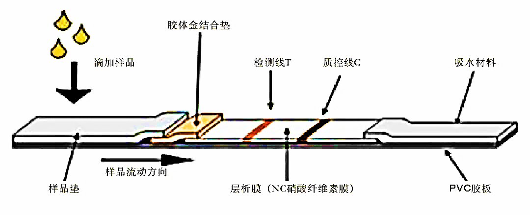 新冠病毒的传播途径多种多样,最为常见的途径是飞沫传播,此外还有接触传播(密接)以及粪口传播等,所以进行人体新冠病毒的有效检测对人类预防及治疗该病毒引发的疾病具有重要意义。目前,我国新冠病毒的主要检测手段有三类,即人们最熟知的核酸检测以及抗原检测和抗体检测。相比大规模核酸检测,抗原检测操作简单、成本较低,可自行检测不需要专业的医护人员,只需要15-20分钟就可看到检测结果,在我国一些地区已经开始施行,那么抗原检测的原理是什么呢?核酸检测技术(PCR),是在检测过程中根据检测样品中有无新冠病毒的基因组片段来判断是否感染,而抗原检测是根据被测检测样本中有无新冠病毒的蛋白质来判断是否感染,如前文所述,新冠病毒表面有N蛋白和S蛋白,而N蛋白的检测是新冠抗原检测中最为常用的,检测过程所利用的原理大都是测流免疫反应原理,下面我们介绍一类抗原检测方法,即抗原检测(胶体金法)。