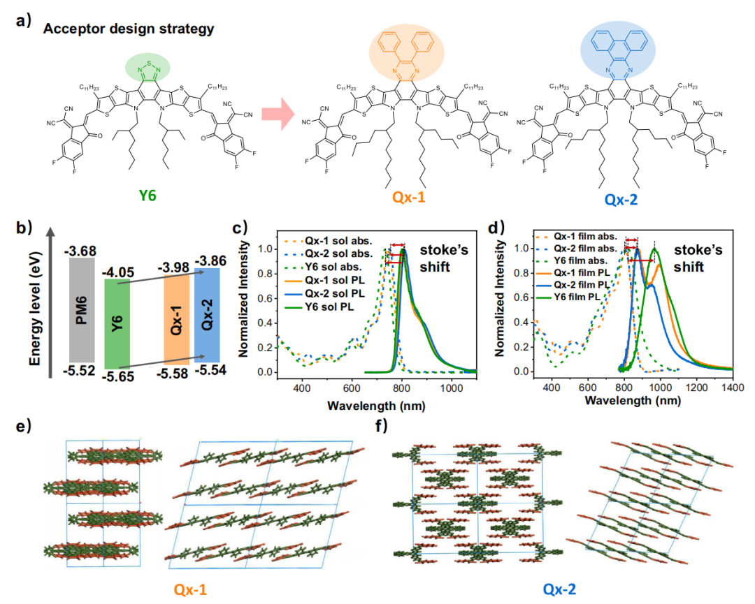 在这项工作中,作者合成了两个体积更大、刚性更高的Qx受体Qx-1和Qx-2作为中心核。作者观察到,通过抑制两种受体中C-C键拉伸的分子振动,发现与传统的Y6受体相比,光电转换过程中的重组能显著降低。因此,由激子解离和非辐射复合引起的能量损失已大大降低。