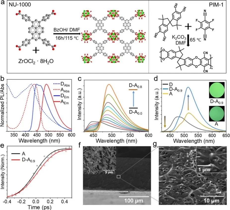 2、作者团队在后续的光谱学研究中,在溶液中观察到从NU-1000供体(D)到PIM-1受体(A)的有效能量转移,根据D发射的淬灭,通过调整二者的重量百分比,制备了一系列具有高效能量转移特性的MMM,用于后续MOF与聚合剂之间的能量转移研究。