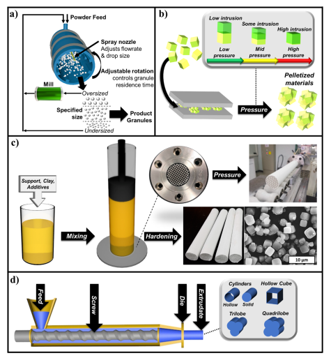 图1 传统的吸附材料骨架制备方法(a)造粒(b)丸化(c)液压挤压成型(d)液压螺杆挤压成型[1]