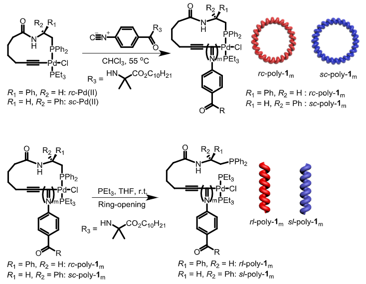 1.合成手性环状 Pd(II)-催化剂可以引发异氰化物的活性扩环聚合,产生具有可预测分子量和低分散性的单手性环状螺旋聚苯异氰化物。