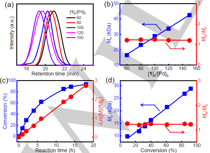(d) Mn和 Mw/Mn 值与1转换的关系图。
