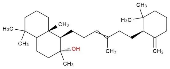 龙涎香独有的香气性质与其化学成分是分不开的,我们可以通过它其中所含的化学成分来了解它散发芳香的原因。科学研究表明,龙涎香是由多种有机物混合形成的,见图4,主要成分有龙涎香醇和诸多胆甾烷醇类有机物组成,龙涎香香气的主要来源之一正是一种三环三萜化合物,即为龙涎香醇,如图5所示。