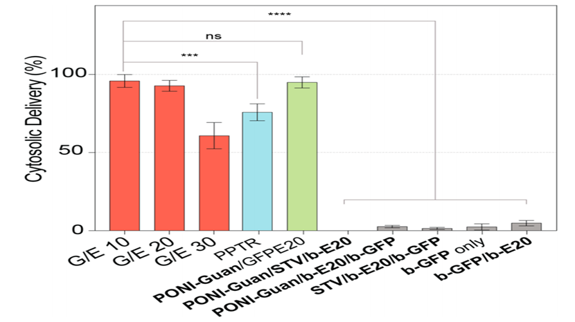 图 5. 成像流式细胞仪数据以细胞群的百分比表示,量化 GFP 的细胞溶质/核递送。如上所述,在不同的 G/E 比(红色)或各种控制条件(灰色)下配制纳米复合材料。将递送与对照进行比较:b-GFP 递送(蓝色)使用商业 Pierce 蛋白转染试剂(Thermo Scientific),在无血清培养基中孵育,以及由 PONI-Guan 在 G/E 10.41 递送的 GFP-E20(绿色)数据为六个重复孔的平均值。误差是总体的标准偏差。支持信息中提供了成像流式细胞术实验的详细信息。通过非配对 t 检验进行统计分析; *** = p < 0.001; **** = p < 0.0001; ns 不显著。