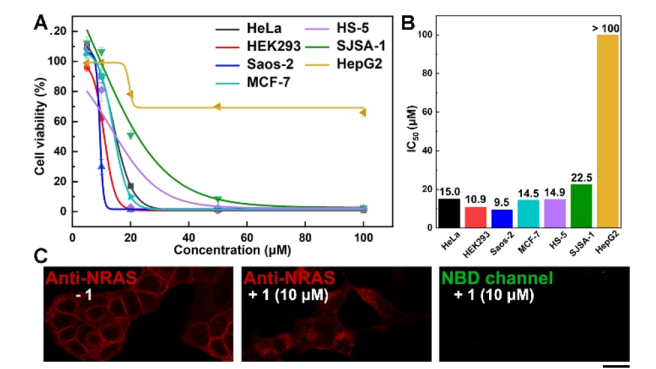 图 3. (A) 细胞毒性和 (B) 1 对不同细胞系(HeLa、HEK293、Saos-2、MCF-7、HS-5、SJSA-1 和 HepG2)的 IC50 (C) 在有或没有 1 (10 μM, 30 min; 比例尺 20 μm) 预处理后用 NRAS 抗体对 MCF-7 进行 ICC 染色。