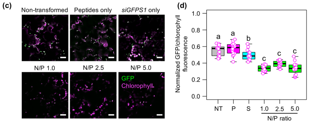(c)用不同N/P比率形成的siGFPS1/肽复合物喷洒3天后,转质体eGFP过表达烟草叶细胞的叶绿体中的GFP荧光,表皮细胞叶绿体中的GFP荧光通常比叶肉强(另见图 S25)比例尺=20 μm;