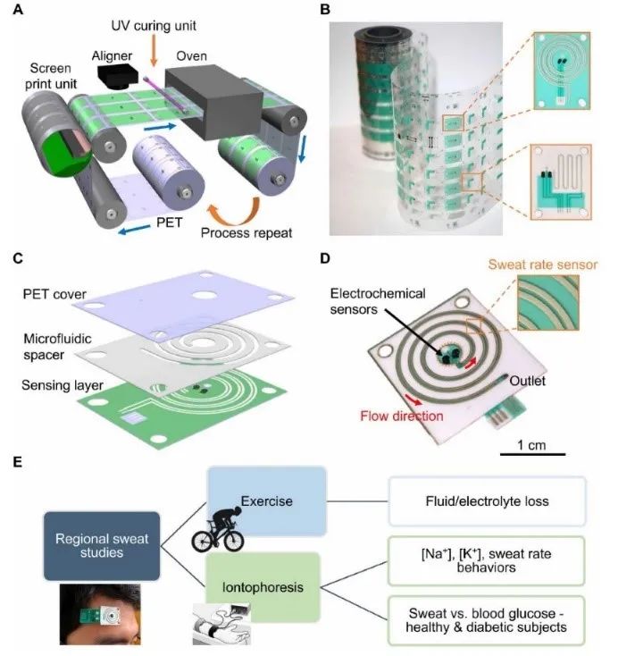 Roll-to-Roll(卷对卷)旋转丝网印刷是一种工业化大批量制造柔性电子器件的有效方法,且成本低廉、技术较为成熟。而激光刻蚀允许材料在小尺度下进行快速图案化,并且可在柔性塑料基板进行微流体通道的雕刻。加州大学伯克利分校Ali Javey教授团队将卷对卷旋转丝网印刷传感电子设备和激光切割微流体通道巧妙地结合起来,成功开发了一种可以大批量生产,具有分析监控用户汗液电化学性质的汗液传感器[6]。这种贴片型传感器的双层结构如下图所示:第一层将用于转换分析物浓度与监测汗液速率的图案化电极系统集成起来,而第二层是具有汗液收集容器和引导汗液流动的螺旋微流体通道的微流体粘合剂层。在微流体内封装汗液减少了蒸发和环境污染带来的影响从而对汗液进行准确的分析,并提供有效的汗液取样以减少混合和遗留。该可穿戴贴片可以同时监测身体不同区域的汗液参数,如钠离子、钾离子葡萄糖等物质的浓度,在运动生理学和医学健康监测中具有广泛的应用。