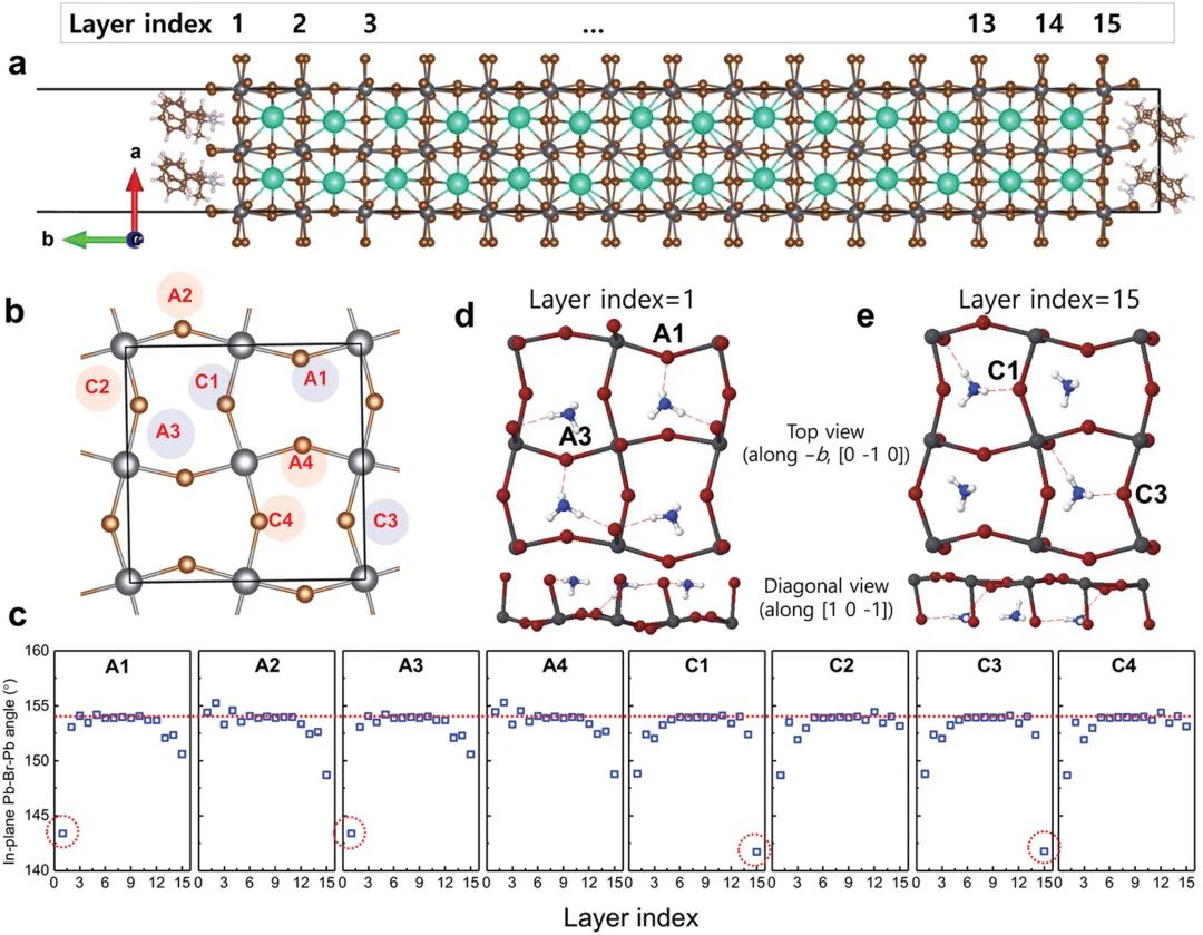 图3. (a) DFT 衍生的 15层钙钛矿晶体无机板模型,[S-MBA]+ 配体附着在相对的晶体表面上。(b) 模拟块状CsPbBr3钙钛矿(正交)晶体结构的(010)平面,标记各种计算的 Pb-Br-Pb 键角。(c,d) 显示了MBA配体(铵基)和 Br-之间的中心不对称氢键相互作用,在 (c) 层指数= 1 和 (d) 层指数= 15。顶部图像是俯视图(-b)方向和底部图像是沿[101̅]方向的对角线视图。(e) 计算钙钛矿晶体与附着在相对表面上的 S-MBA 配体的层相关键角。红色虚线圆圈突出了由 S-MBA 配体引起的中心不对称晶体畸变。