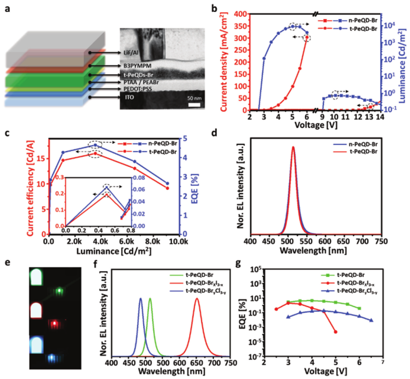 图3. a)t-PeQD-Br LED的器件结构和横截面TEM图像。b)n-PeQD-Br和t-PeQD-Br LED的电流密度(J)-电压(V)-亮度(L)特性图。c)电流效率(CE)-亮度(L)-外部量子效率(EQE)特性图。d)归一化EL光谱。e)t-PeQD-X LED设备的照片(顶部:绿色(t-PeQD-Br),中间:红色(t-PeQD-BrxI3-x),底部:蓝色(t-PeQD-BryC3-y)。f)绿色(t-PeQD-Br)、红色(t-PeQD-BrxI3-x)和蓝色(t-PeQD-BryC3-y)LED的标准化EL光谱及g)EQEs。