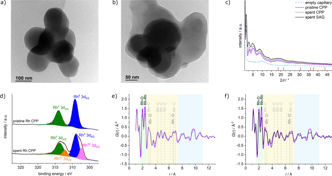 图5. (a) 初始的和 (b) 使用过的 C12Rh-CPP 的 TEM 图像。(c)原始C12Rh-CPP催化剂(紫色)、使用过的 C12Rh-CPP 催化剂(灰色)和使用过的 C12Rh-SAG 催化剂(黑色)的粉末 XRD 图(均使用Mo Kα 辐射测量)。 (d) 初始的和使用过的催化剂的 XPS光谱。 (e) PDF 分析:初始的 C12Rh-CPP(紫色)和使用过的 C12Rh-CPP 催化剂(灰色)的 G(r) 曲线,和 (f) 初始的 C12Rh-CPP(紫色)和使用过的C12Rh-SAG 催化剂(黑色)的 G(r) 曲线。