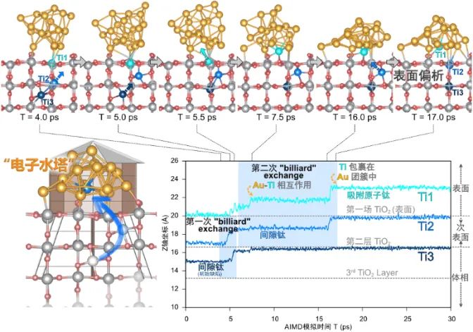 图1.Au/TiO2-x催化剂体相隙钛缺陷(蓝色)向金属–载体界面的自发扩散(AIMD模拟温度700 K)