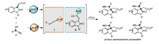 中国科学技术大学龚流柱和安徽大学宋琎团队应用手性氮杂环卡宾和铜配合物协同催化剂体系,成功实现了靛红衍生的α,β-不饱和醛与炔丙基乙酸酯的立体发散性不对称炔丙基化反应,以优秀的收率和立体选择性得到一系列结构多样的手性3,3’-双取代氧化吲哚衍生物。作者可以通过简单地改变手性氮杂环卡宾催化剂与手性铜配合物催化剂的构型组合,实现氮杂环卡宾活化亲核中间体对联烯铜中间体的立体发散性加成,方便地制备出目标产物的所有四个立体异构体,并且均能获得优异的收率和立体选择性。
