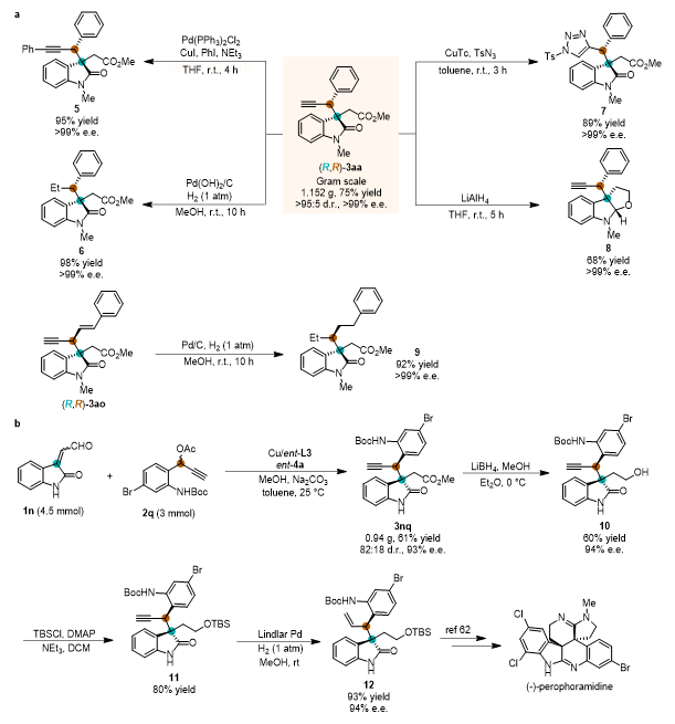 作者还进行了一系列的衍生化实验进一步证实了该反应的实用性(图8)。其中,炔丙基化产物3aa及3ao可以进行多种类型转化获得一系列手性3,3’-双取代氧化吲哚衍生物。作者从α,β-不饱和醛1n与炔丙基乙酸酯2q出发,经过几步简单的转化即可得到天然产物(-)-perophoramidine的合成关键中间体12。