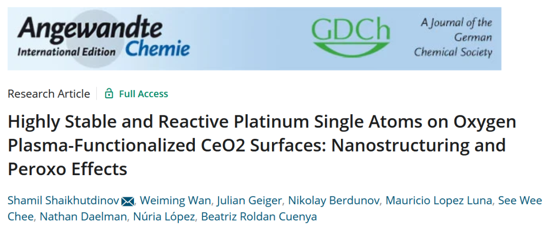 德国界面科学系弗里茨哈伯研究所的Shamil Shaikhutdinov和巴塞罗那科学技术研究所机构Núria López教授等人讨论了氧化物载体的表面结构如何影响金属的分散和单原子在高温和气氛中的稳定性的问题。制备了 Pt/CeO2模型催化剂,并对催化剂进行不同的预处理,其中氧等离子体预处理后沉积在 CeO2薄膜上的铂原子在 CO 氧化反应中表现出最好的热稳定性和催化活性。密度泛函理论(DFT)进一步证实了这种效应: (i)等离子体诱导的表面重组导致氧化铈团簇的产生,以及(ii)大量表面过氧物种(O22-)的形成,这些都有利于孤立和高稳定的铂单原子的密集和均匀分布。开拓了一个利用等离子体功能化处理,实现高密度稳定的多相催化活性位点的新领域。