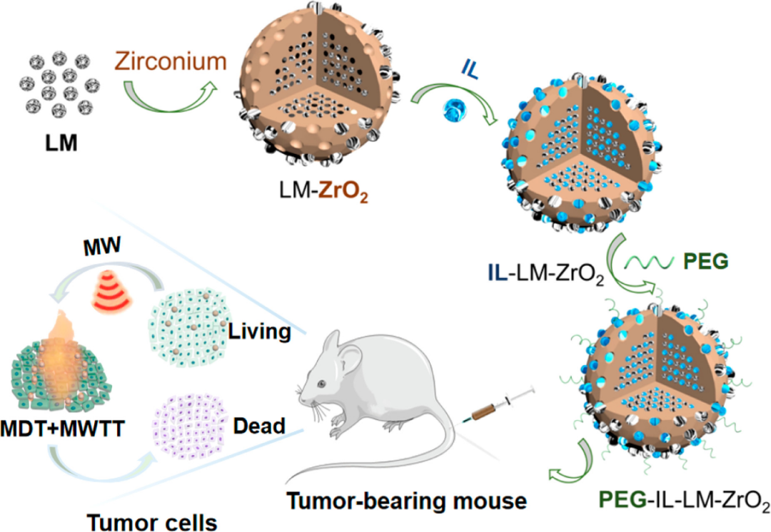图2 PEG-IL-LM-ZrO2 SNP 联合 MDT 与 MWTT 治疗肿瘤示意图