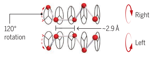图3. 左手和右手螺旋:元素Te中的2.9 Å长键形成螺旋。