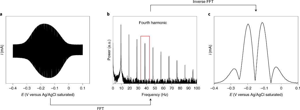 图 3:FTacV 测量数据处理的示意图。a,来自 FTacV 测量的原始数据。I,电流;E、电压。b,使用快速 FFT 算法分析数据,该算法将电流从时域转换到频域,在频域中可以将其绘制为功率谱。功率谱中的每个频带都是,基频在后者频率的整数倍处的谐波。使用窗口滤波器(b 中的红色矩形)选择每个谐波,同时将剩余数据归零。c,通过逆FFT算法变换回时域后的滤波谐波。研究人员可以绘制谐波电流与直流电势的关系图,然后进行分析。