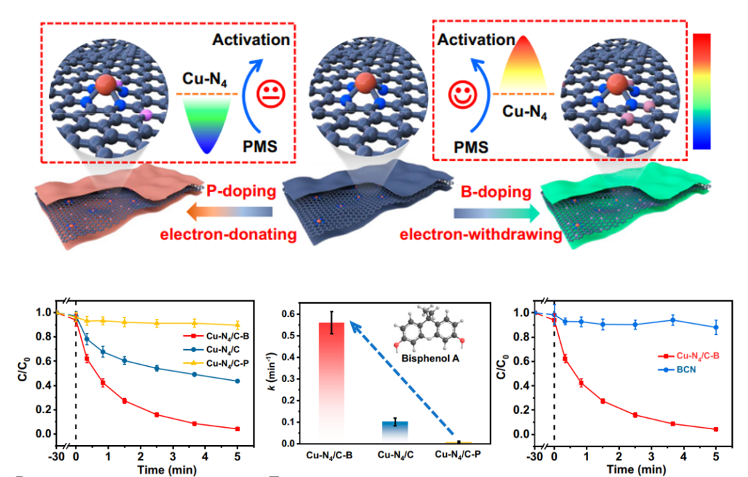 近日,同济大学环境学院王颖教授团队联合中国科学技术大学研究团队在国际权威刊物美国科学院院刊PNAS上发表了题为“Identification of Fenton-like active Cu sites by heteroatom modulation of electronic density”的研究论文。通过在碳基底中引入缺电子的硼元素(B)或富电子的磷元素(P),系统调节了Cu中心的电子密度,并研究了其对活化PMS降解双酚A(PBA)的反应动力学的影响。其中,Cu-N4/C-B材料具有最佳的催化氧化能力,优于绝大部分非均相类芬顿催化剂。这项工作为单原子金属中心的电子结构调控和原子水平上的构效关系提供了深入见解。