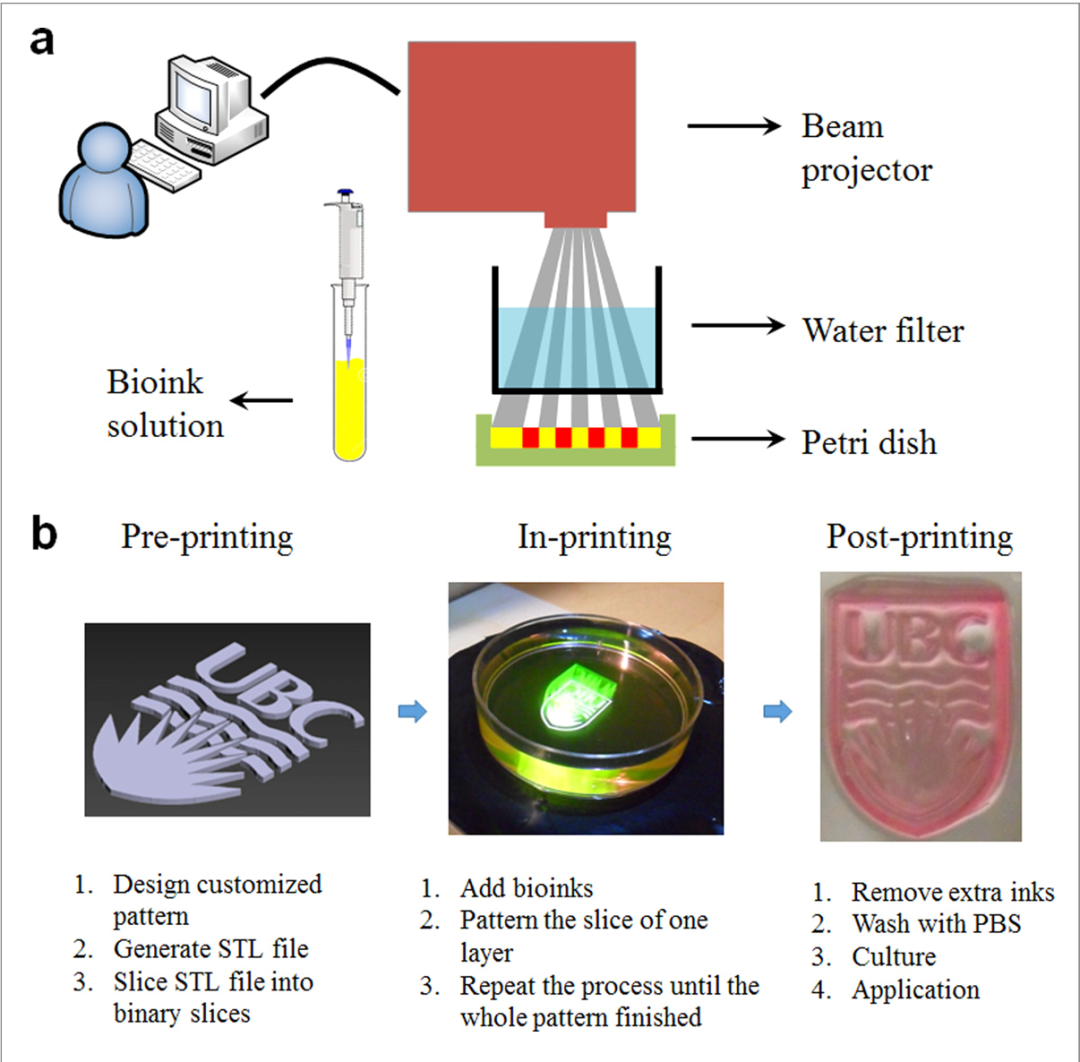 生物打印的立体光刻 (SLA) 方法利用光聚合,这是一种将紫外线或激光以图案引导到光聚合液体聚合物路径上的过程,将聚合物交联成硬化层。随着每一层的聚合,打印平台可以进一步降低到聚合物溶液中,允许多次循环以形成 3D 结构。当可固化丙烯酸树脂和环氧树脂用作可光聚合材料时,该技术特别有用。
