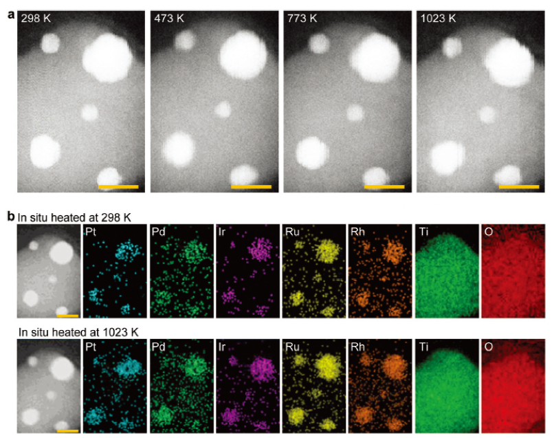 以合成的PtPdIrRuRh-TiO2-Carbon为模型体系,通过原位加热该催化剂并观察催化剂的形态分布及元素组成,以评估其热稳定性。PtPdIrRuRh-TiO2-Carbon样品在1023 K温度下仍保持初始形态(即在298K时),PtPdIrRuRh纳米颗粒附着在TiO2上且各元素均匀混合并未发生相分离,显示出优异的热稳定性。