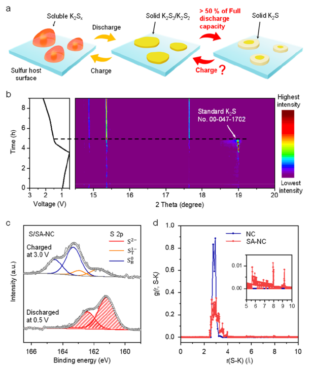 图 1:(a) K-S 电池充放电示意图。(b) S/SA-NC 电极的恒电流放电曲线和相应的原位同步加速器 XRD 图案。(c) S/SA-NC 在 0.5 V和 3.0 V 电荷放电下的 XPS 光谱。(d) 来自 800 fs AIMD 轨迹结果的 S-K 键长的 RDF。