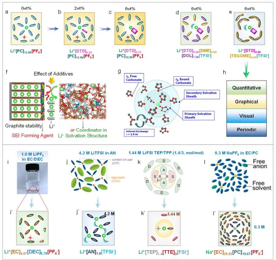 尤其,交换实验表明,一旦将DTD添加剂从PC基或醚基电解液中移除,即使SEI膜完好,石墨@SEI也无法抑制Li+-溶剂共嵌,从而证明添加剂改变的Li+溶剂化结构比生成的SEI膜更能主导石墨性能。 作者关于溶剂化结构量化、图像化、可视化、以及周期化的描述(图5h),不仅综合考虑了离子-离子和离子-溶剂的相互作用,还能够更加清楚地展现各类电解液体系(例如高浓度、局部高浓度、低浓度等)中分子、离子之间的相互作用(图5i-l,i’-l’),有助于解析溶剂化结构与电池性能之间的构效关系,实现电解液精准设计。
