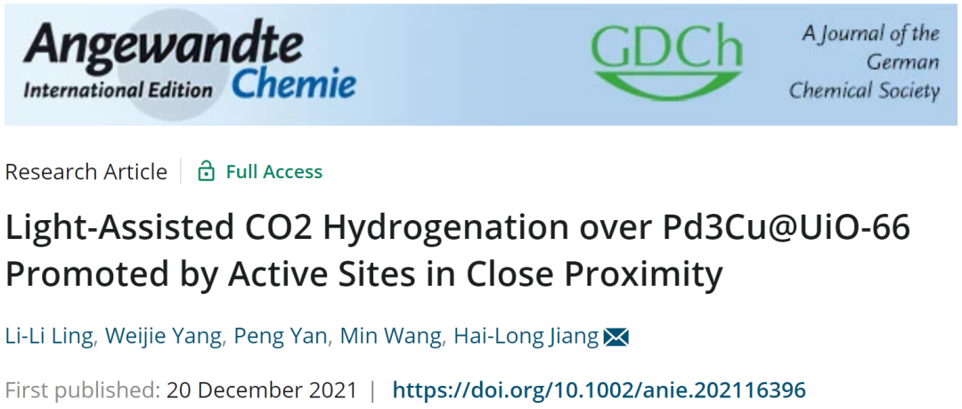 2021年12月20日,中国科学技术大学的江海龙教授课题组在Angew. Chem. Int. Ed. 上发表了一篇题为“Light-Assisted CO2 Hydrogenation over Pd3Cu@UiO-66 Promoted by Active Sites in Close Proximity”的新研究。