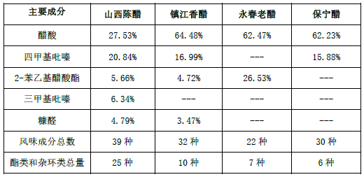 对比中国传统四大知名食醋的主要成分含量(表2),我们可以发现山西老陈醋中醋酸的含量明显低于其他三种醋,四甲基吡嗪含量最高,且含有最多的呈香物质,含有烤面包香气和坚果香气酯类和杂环类物质(尤其是吡嗪类物质)的种类和含量明显多于其他3种醋。山西老陈醋中醋酸的相对含量只有28%左右,这说明山西陈醋的香气体现更多来自于挥发类成分的协同作用,这使得山西老陈醋酸香浓郁,食之绵柔,醇厚不涩,相比其他醋更具有独特的口感[6]。