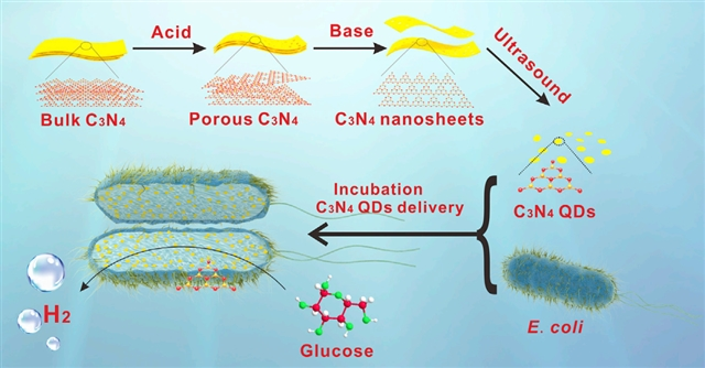 有效收集太阳能并将其转化为氢气等化石燃料,是一项巨大的挑战。对可再生、可持续、高效制氢的迫切需求推动了先进制氢技术的快速发展,而全细胞微生物制氢是最有前途的策略之一。张中海课题组报道了一种体内非金属无机半导体-微生物杂化体系,C3N4 QDs穿透到大肠杆菌内,从而能直接在细菌内光催化,实现高效催化生物质产氢。该工作揭示了细胞内无机-生物混合系统的优势,将无机材料的光收集能力与微生物的代谢能力相结合,以生产生物燃料和化合物,揭示了体内杂化体系在产氢方面的优势。并以一种可选择的更多样的方式为提升太阳能转换效率提供了一种新的方式。
