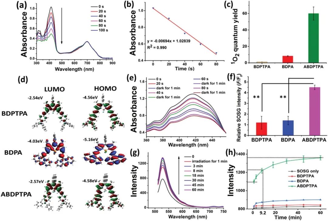 图3. (a)DPBF降解情况; (b)DPBF降解线性拟合; (c)1O2量子效率比较; (d)几何结构优化; (e)暗态下DPBF在ABDPTPA中的衰减; (f)辐照4分钟后的相对荧光强度; (g)辐照1分钟后存在ABDPTPA NPs的SOSG的荧光强度; (h)辐照1分钟后的对照荧光强度