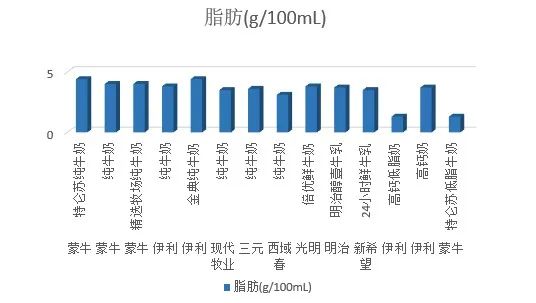 伊利高钙低脂奶、蒙牛特仑苏低脂牛奶含脂肪为1.3g/100mL,普通牛奶在3~4g/100mL。如果以普通瓶装250mL计算,一瓶低脂奶含脂肪3.25g,而普通牛奶在7.5~10g之间,看起来差别很大,但是相较于普通人每天在膳食中摄取的脂肪,牛奶中的脂肪含量并不算多。