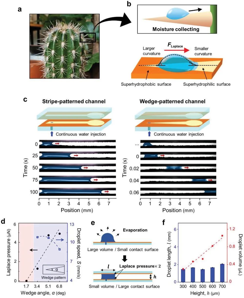 通过模仿仙人掌脊柱的设计并使用楔形图案和超疏水/超亲水表面的润湿性差异再现了仙人掌脊柱的结构特性。楔形图案表面上的液滴自发地移动到楔形图案的宽端,因为在液体表面产生的拉普拉斯压力会在超亲水区域的方向上产生力。