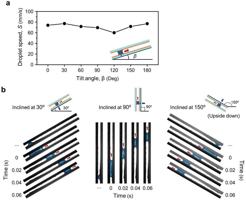 图3.斜坡上拉普拉斯压力驱动的自动液滴输送