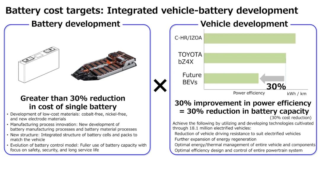 新电池技术介绍 支持电动汽车全系列产品的三大核心技术是电动机、电池和动力控制单元。 今天,在此背景下,关于电池,我想与大家分享丰田通过大规模生产电动汽车而形成的独特方法和竞争优势。 在推动全系列电动汽车的同时,我们也一直在开发和制造全系列的电池。 对于HEV,我们的重点是输出功率,或者说是瞬时功率,而对于PHEV和BEV,我们的重点是容量,也就是所谓的“续航”。 作为HEV的电池,我们一直在利用镍氢电池和锂离子电池各自的特性来不断发展改进。 我们今年推出的双极镍氢电池专注于提供瞬时动力,将用于越来越多的车辆。 对于PHEV和BEV的锂离子电池,我们一直在努力提高成本和续航能力,在前进的过程中继续改进它们。 我们正在开发更先进的新型锂离子电池,将于2025年后推出。 从这里开始,我想阐述一下丰田在电池开发方面的价值。 丰田最看重的是开发客户可以放心使用的电池。 特别是,我们专注于安全、长寿命和高品质,以生产优质、低成本、高性能的电池。 更长的使用寿命会影响车辆的残值。 在续航里程方面,还需要更高能量密度和高水平的电池。 我们想让充电速度更快,但太快会影响安全。 因此,我们认为在这些因素之间取得平衡以确保安全使用非常重要。 自第一代普锐斯安装电池以来,这一概念一直保持不变,我们所有电动汽车的电池也是如此。 通过将我们在HEV电池方面积累的经验应用于未来的 BEV 电池,我们相信我们将能够提供可以放心使用的电池。 现在,我想通过三个例子来介绍生产可以安全使用的电池所需的许多努力,以锂离子电池作为我的解释重点。 这是确保安全的一个例子。 众所周知,在激烈驾驶或其他对电池施加大负载的驾驶过程中,每个电池单元都显示出局部异常发热的迹象。 通过分析电池内部发生的现象并进行大量模型实验,我们已经能够阐明驾驶方式对电池的影响,以及这种影响的机制。 基于这些结果,我们能够通过对单个电池、电池块和整个电池组的电压、电流和温度的多重监控来检测电池局部异常发热的迹象,然后控制电池以防止异常发热。 即使涉及到 BEV 系统,我们也将基于每支电池安全和可靠的理念,并将其继续完善。 我想与您分享的第二个例子是我们对长使用寿命的承诺。 我们将通过开发HEV电池所积累的技术应用于PHEV,C-HR BEV中的电池,10年后的容量保持率远高于我们迄今为止用于 PHEV 的电池。 此外,对于即将推出的丰田bZ4X,我们设定了90%的耐力性能目标,这是世界上最高的之一,目前我们正在完成开发工作以实现这一目标。 我想介绍一些我们正在努力实现长使用寿命的开发示例。 通过对锂离子电池内部的详细分析,我们知道负极表面的降解对电池的寿命有很大的影响。 为了抑制这些劣化材料的产生,我们正在阐明产生机制,并在材料选择、包装结构和控制系统等各个方面采取措施。 我想与您分享的第三个例子与我们为实现高水平质量所做的努力有关。 如果金属异物在制造过程中进入电池造成内短路,则存在发生故障的可能性。 我们确认了进入制造过程的异物的形状、材料和大小及其对耐久性的影响,并阐明了这些对电池的影响。 基于此,我们非常关注异物的大小和形状,我们正在以防止相关异物的产生或进入为目的的方式管理流程。 我刚才讲的只是我们正在做的一些事情,但是通过这种稳定细致的分析,以及从市场上1810万台车反馈中获得的经验,我们的目标是继续交付可以让用户放心使用的电池。 接下来,我要解释一下今年7月宣布的新Aqua中使用的双极镍氢电池。 我们与丰田工业公司共同开发了这种电池,接受了开发双极结构的挑战,并将其用于车载电池进行了商业化。 相较于上一代Aqua使用的电池,输出功率提高了一倍,汽车加速更快。 至于下一代BEV的电池,我们将自1996年推出RAV4 EV以来培育的BEV技术,以及我们通过HEV培育的最新电池技术都已被纳入TOYOTA bZ4X,并将很快引入市场。 从现在开始,我想解释一下未来的电池。 为了普及BEV,我们希望降低成本并以合理的价格提供BEV。 首先,我们的目标是通过开发材料和结构将电池本身的成本降低30%,甚至更多。 然后,对于车辆,从丰田bZ4X开始,我们的目标是将功耗(作为每公里用电量的指标)降低30%。 通过这种车辆和电池的集成开发,我们的目标是在2025年后将每辆车的电池成本与丰田 bZ4X相比降低50%。 请允许我解释即将到来的下一代电池。 对于液态电池,我们将迎接材料进化和结构创新的挑战。 我们还将致力于实现全固态电池的商业化。 如上所述,我们将开发三种类型的电池,到2025年后,我们希望改进每种类型的特性,以便我们可以提供可以放心使用的电池。 接下来,我想解释一下我们与全固态电池相关的举措。 去年6月,我们制造了一辆配备全固态电池的汽车,在测试路线上进行了试运行,并获得了行驶数据。 基于这些数据,我们不断改进,去年8月,我们获得了全固态电池车辆的牌照并进行了试驾。 我们在开发过程中学到了一些东西。 由于离子在其中的快速移动,全固态电池有望具有更高的倍率。 因此,我们希望通过在HEV中也使用全固态电池。 另一方面,我们发现使用寿命短是一个问题。 为了解决这个和其他问题,我们需要继续开发,主要是固体电解质材料。 我们认为发现问题使我们离商业化更近了一步。 电池供应体系的