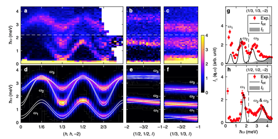 图4: 利用自旋波理论求解的二维海森堡模型的激发(图d,e,f),中子散射对实际海森堡模型描述的材料的测量结果(图a,b,c)[4]