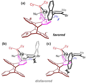 通过底物范围筛选,该反应条件可以在含有卤素、喹啉、芘基、萘基、吡啶、喹啉等不同官能团的底物上成功地高效应用,合成具有高立体选择性的目标产物。作者进一步提出了一种可能的立体化学模型来解释反应手性诱导过程(图9)。基于Buchwald课题组提出的二烷基联芳基单膦配体的催化碳氮偶联反应机理,作者认为配体1的联苯基部分的垂直构象将使配体的A环稳定二价钯的配位,从而因位阻原因使亲电试剂会在氧化加成过程中来有效避免B环(图9a)。此外,配体背面的邻位取代苯基(F环)和底部的蒽光二聚体的C环可以限制亲电试剂的旋转构象(图9b,c)。这种可能的诱导模型生成的产物与反应实际获得的产物的绝对构型一致。