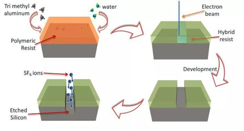 美国能源部布鲁克海文国家实验室的研究人员采用原子层沉积(ALD)系统,将有机聚合物聚甲基丙烯酸甲酯(PMMA)与氧化铝结合起来,创造了杂化有机-无机光刻胶。他们在将涂有PMMA薄膜的衬底放到ALD反应室中之后,引入了铝前驱物蒸汽。这个蒸汽通过PMMA基质内部的微小分子孔扩散,与聚合物链内部的化学物质结合到一起。然后,他们引入了另一种前驱物(例如水),与第一个前驱物反应形成PMMA基体内部的氧化铝。该杂化光刻胶的蚀刻选择比远远高于ZEP(一种昂贵的光刻胶)和二氧化硅。