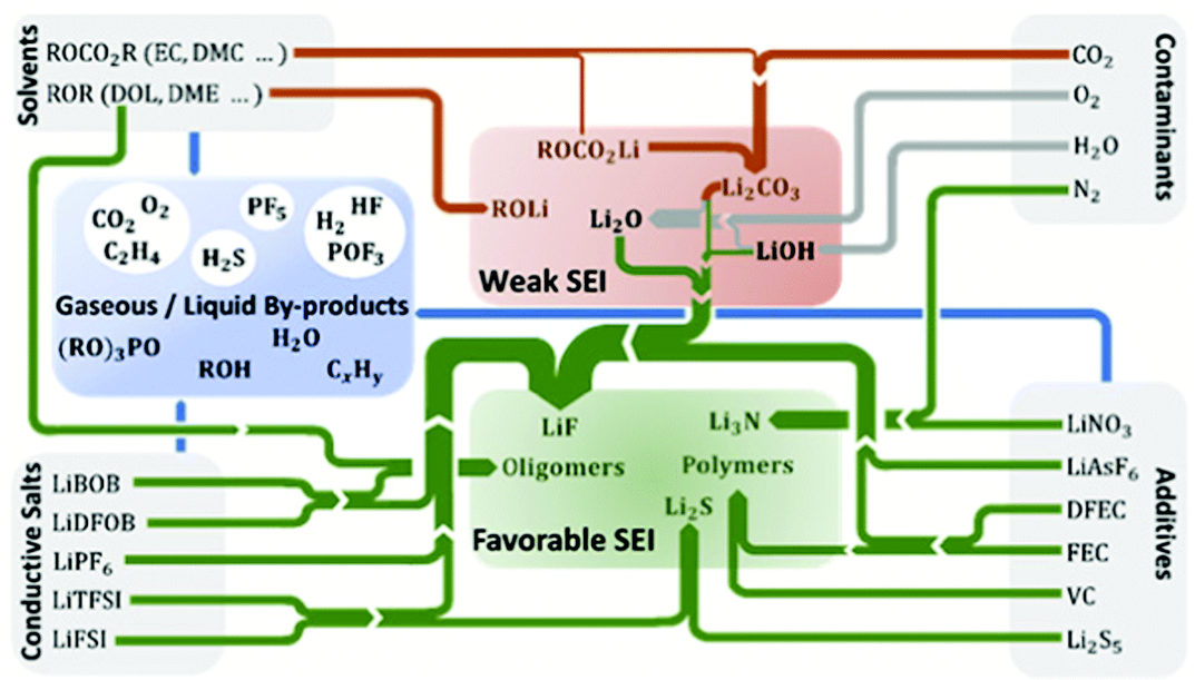 图4.锂金属电池中最常见的SEI成分以及来自电解质成分的气体或液体降解产物的形成。SEI的成分被分为表现出有利或减弱SEI特性的部分。