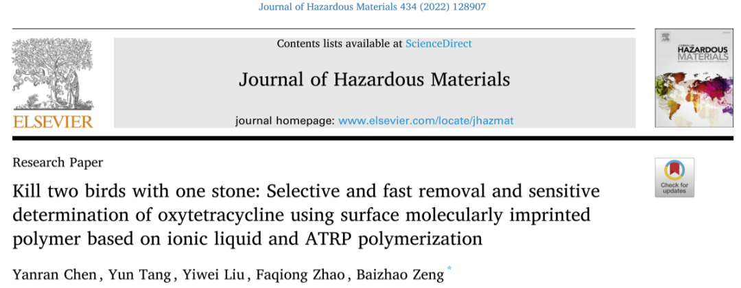 1、一石二鸟: 基于离子液体和ATRP聚合的表面分子印迹聚合物选择性快速去除和灵敏测定土霉素