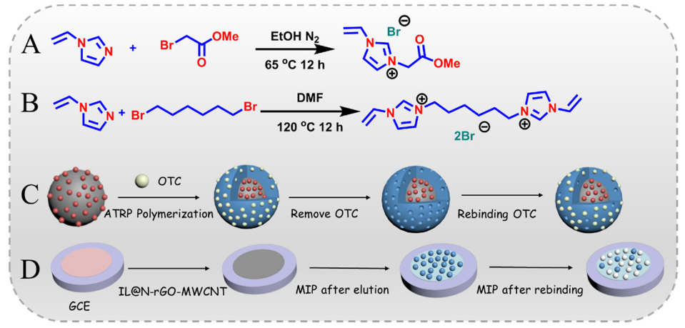 作者团队以土霉素 (OTC)为模板,金纳米修饰碳纳米球 (Au-CNS) 为载体,离子液体 (IL) 为功能单体,交联剂,通过原子转移自由基聚合制备了一种新型的分子印迹聚合物 (MIP) 复合材料。用傅里叶变换红外吸收光谱、x射线光电子能谱、扫描电子显微镜和透射电子显微镜对获得的MIP-IL @ Au-CNS复合材料进行了表征。它显示出较高的印迹因子 (5.50) 和吸附容量 (56.7 mg g −1),并且可以在短时间 (约15 min) 内达到吸附平衡。结果还表明,吸附过程基本符合准二阶动力学模型和Freundlich模型,MIPIL @ Au-CNS可循环至少5次。此外,通过将MIP-IL @ Au-CNS与IL改性的碳纳米复合材料 (IL @ N-rGO-MWCNT) 相结合,开发了一种灵敏的OTC电化学传感器。所得传感器在0.02-20μm的宽范围内显示出对OTC的线性响应,并且检测限降至5 nm。它还具有高选择性、快速洗脱/再生和简单的操作程序的优点。该传感器已用于检测真实样品和可接受的回收率。