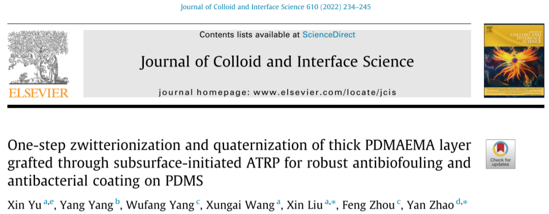 作者团队展示了通过亚表面引发的原子转移自由基聚合 (SSI-ATRP) 在 PDMS 上接枝厚的聚 ((2-二甲氨基) 甲基丙烯酸乙酯) (PDMAEMA) 层。DMAEMA 单体自迁移到 PDMS 的地下被证明是 SSI-ATRP 成功的主要因素。在相同条件下,PDMS 上制备的厚微米级接枝层比常规表面引发原子转移自由基聚合 (SI-ATRP) 获得的纳米级接枝层具有更好的耐磨性。利用 PDMAEMA 的叔胺,通过简单的一步法实现 PDMAEMA 厚层的同时两性离子化和季铵化。作者团队研究了两性离子化和季铵化程度对抗生物污染和抗菌性能的影响。结果表明,相对较高的两性离子化度(75 mol%)和较低的季铵化度(25 mol%)对防污和杀菌活性均表现出良好的平衡效果。作者的这项工作可能会导致通过 SSI-ATRP 策略开发强大的双功能抗生物污损和抗菌表面。