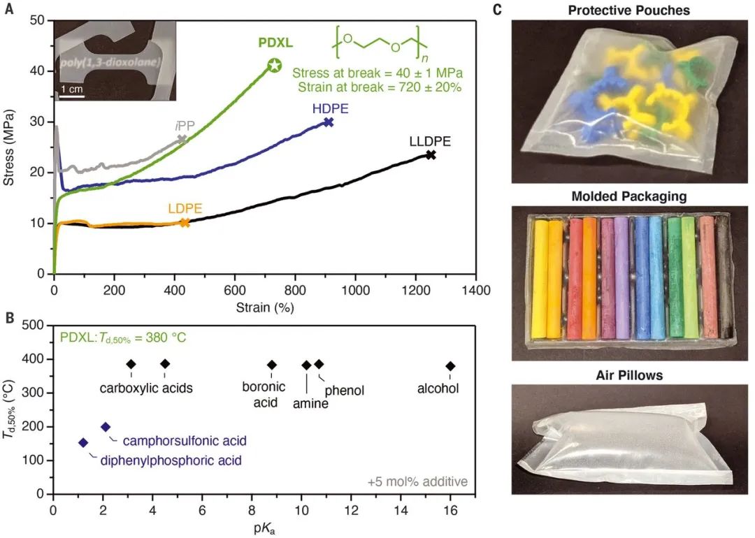 【聚(1,3-二氧戊环)的拉伸性能和热稳定性】 为了测量分子量对拉伸性能的影响,作者合成了10克规模的PDXL,Mn,GPC值范围为37.9至220 kDa,并将块状PDXL熔融压制得到无色、不透明的薄膜(图3A)。低分子量PDXL(37.9 kDa)在5±0.3%应变(εΒ)下的拉伸断裂应力(σB)仅为13.5±1.3 MPa,在82.3 kDa时,PDXL拉伸性能显着增加至σB=33.3±1.2 MPa和εΒ=640±45%,在180 kDa时,PDXL显示出高拉伸强度,σB=40.4±1.2 MPa和εΒ=720±20%,揭示了PDXL在高分子量下令人印象深刻的韧性和延展性(图3A)。 PDXL的拉伸强度可与两种最普遍的商品塑料材料,全同立构聚丙烯(σB=26 MPa和εΒ=420%)和高密度聚乙烯(σB=30.2 MPa和εΒ=900%)相媲美。PDXL在弱酸和胺存在下表现出良好的热稳定性 ( Td,50%≥380 °C),但在强酸添加剂 (pKa≤2.1) 中容易降解。PDXL 原型产品是通过 PDXL薄膜的熔融加工形成的(图3C)。