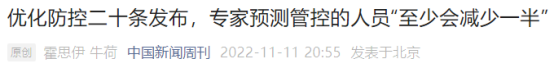最近这段时间,颇受关注的国内官方新闻,“11月11日下午国务院联防联控机制综合组发布的优化疫情防控的二十条最新措施。”想来能算是一条。 有不愿具名的公共卫生专家在接受《中国新闻周刊》采访时表示,根据这新颁布的“二十条”措施进行了大概估算,这次调整之后,总体而言,疫情管控的人员规模“至少会减少一半”。